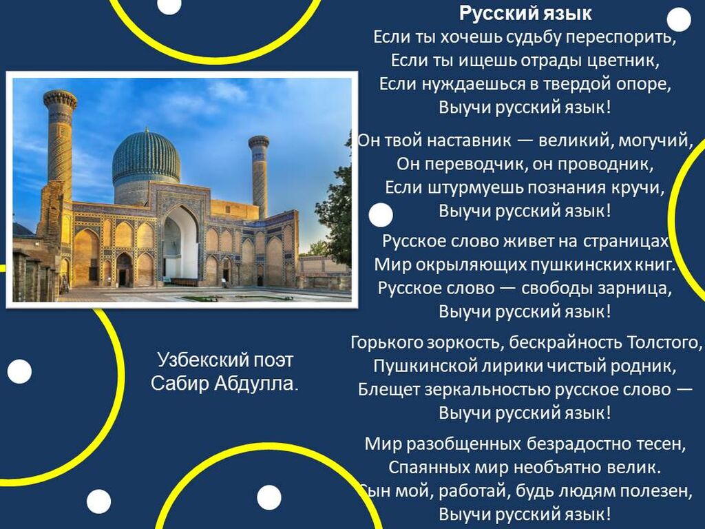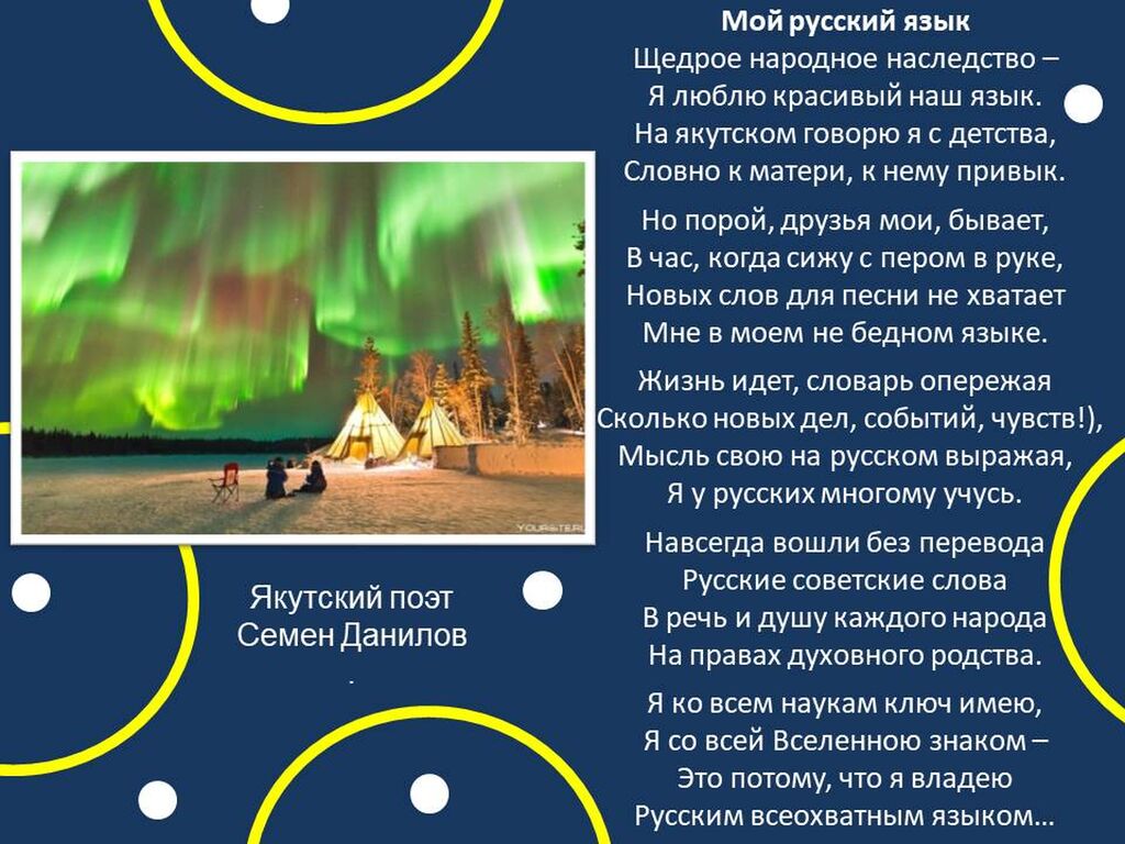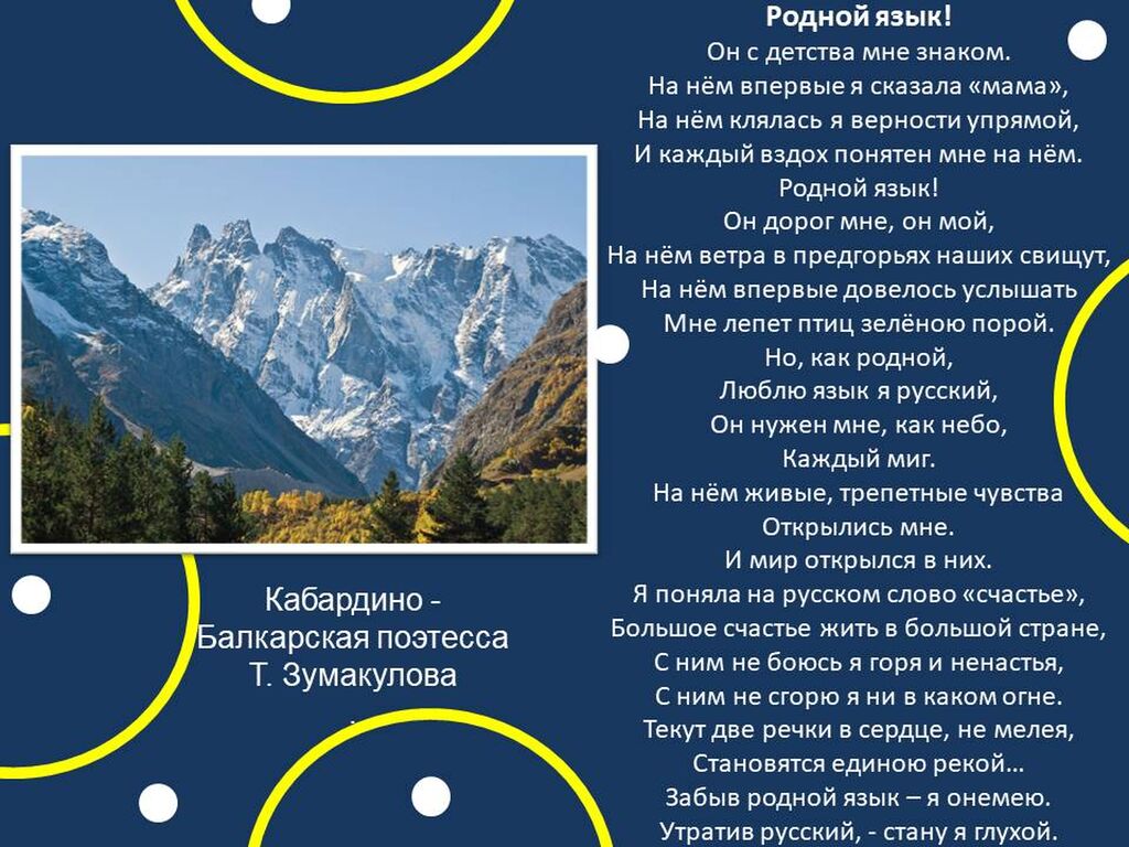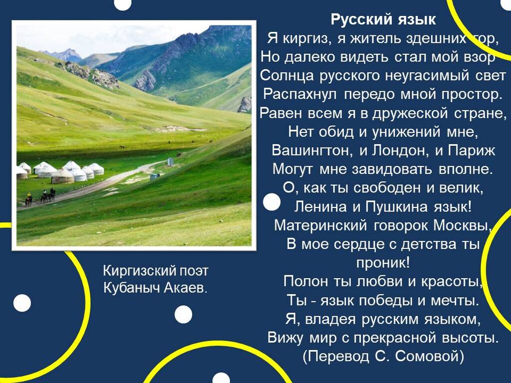 Богатство и красота русского языка, созданной на нем литературы вызывает интерес к этому языку во всем мире. Его стремятся изучать не только студенты, школьники, но и взрослые люди других стран. В карточках ниже приводятся стихотворения о русском языке поэтов разных национальностей.