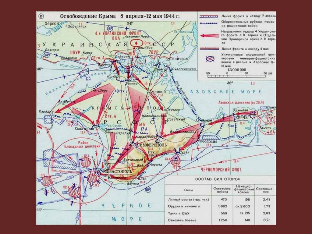 «КРЫМСКАЯ НАСТУПАТЕЛЬНАЯ ОПЕРАЦИЯ СОВЕТСКИХ ВОЙСК ЗАКОНЧИЛАСЬ 12 МАЯ 1944 ГОДА СОКРУШИТЕЛЬНЫМ РАЗГРОМОМ 200-ТЫСЯЧНОЙ 17-Й НЕМЕЦКОЙ АРМИИ. ВСЯ ЕЁ БОЕВАЯ ТЕХНИКА И ПРИПАСЫ ОКАЗАЛИСЬ В РУКАХ СОВЕТСКИХ ВОЙСК. 250 ДНЕЙ ОСАЖДАЛИ НЕМЕЦКО-РУМЫНСКИЕ ВОЙСКА СЕВАСТОПОЛЬ В 1941–1942 ГОДАХ. НАМ ЖЕ ПОТРЕБОВАЛОСЬ ЛИШЬ 35 ДНЕЙ, ЧТОБЫ ВЗЛОМАТЬ МОЩНЫЕ УКРЕПЛЕНИЯ ВРАГА В КРЫМУ; ИЗ НИХ УШЛО ТОЛЬКО ТРИ ДНЯ, ЧТОБЫ СОКРУШИТЬ КУДА БОЛЕЕ СИЛЬНО РАЗВИТУЮ, ЧЕМ У НАС В 1942 ГОДУ, ДОЛГОВРЕМЕННУЮ ОБОРОНУ ПОД СЕВАСТОПОЛЕМ И ОСВОБОДИТЬ ГЛАВНУЮ БАЗУ ЧЕРНОМОРСКОГО ФЛОТА» - ИЗ ВОСПОМИНАНИЙ МАРШАЛА А. М. ВАСИЛЕВСКОГО О РАЗГРОМЕ НЕМЦЕВ В КРЫМУ.