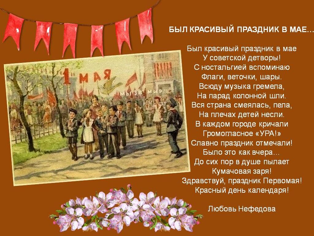 В нашей стране после революции 1917 года праздник стал официальным и одним из главных в календаре СССР. На Красной площади проводились масштабные парады, а улицы городов заполнялись демонстрантами с транспарантами и воздушными шарами. Знаменитый лозунг «Мир! Труд! Май!» знает каждый, кто жил в Советском Союзе.